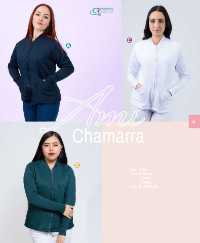 C A 15 B Tela: Aspen Color: A) Marino B) Verde C) Blanco Talla: 16, CH, M, G, EG 15
